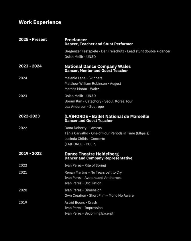 Over the past 7 years I've been working full time with dance companies including Ballet National de Marseille x (LA)HORDE, Dance Theatre Heidelberg and the National Dance Company of Wales. I am now freelancing as a dancer, teacher, stunt performer and photographer